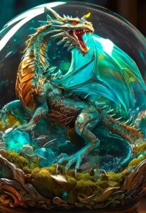 A lovely colourful stylised mythical Chinese style blue dragon in globe on desk. GoArt Pro app composite art by Christopher Langley