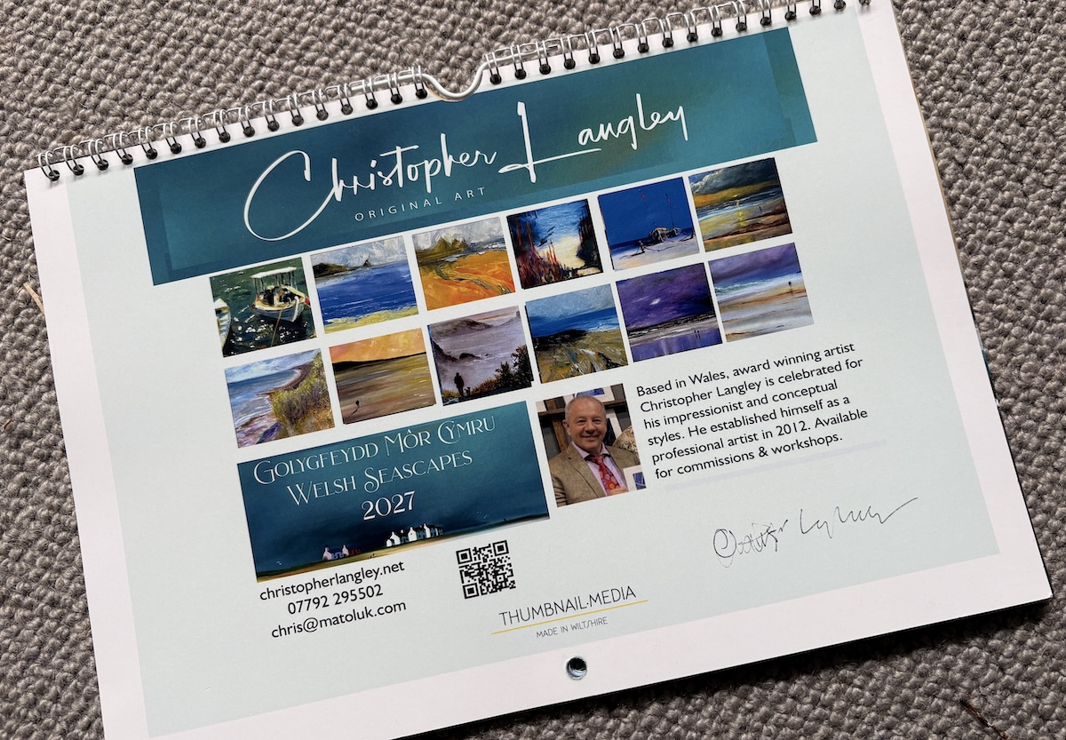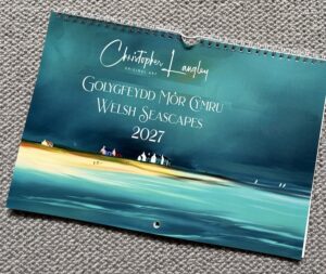 Welsh Seascapes 2027 hand signed calenday by Welsh Artist Chris Langley, featuring prints of 12 original artworks of the Welsh Coast.